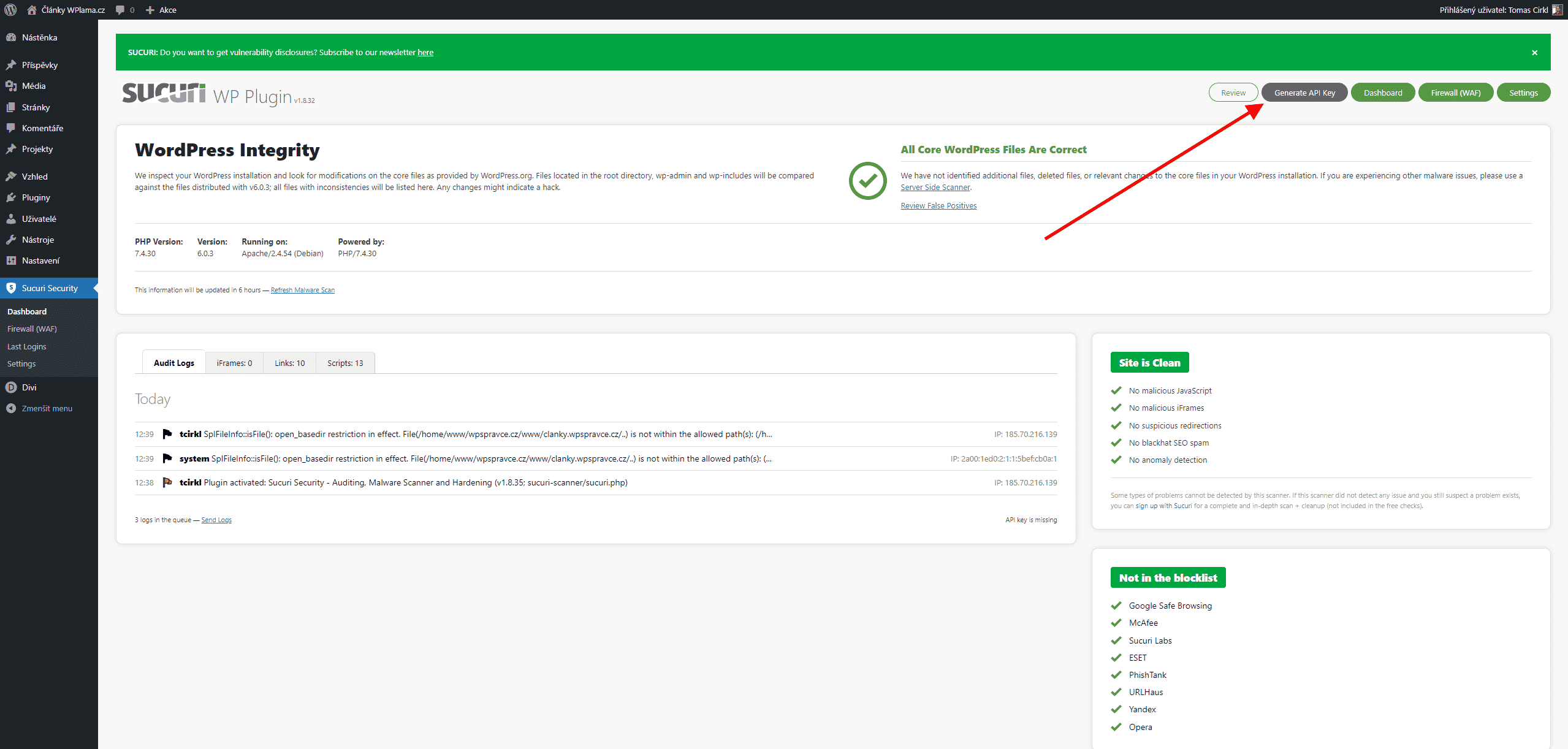Po instalaci a aktivaci pluginu Sucuri se zobrazí oznámení, že je třeba vygenerovat bezplatný klíč API, abyste mohli plně aktivovat všechny jeho funkce.